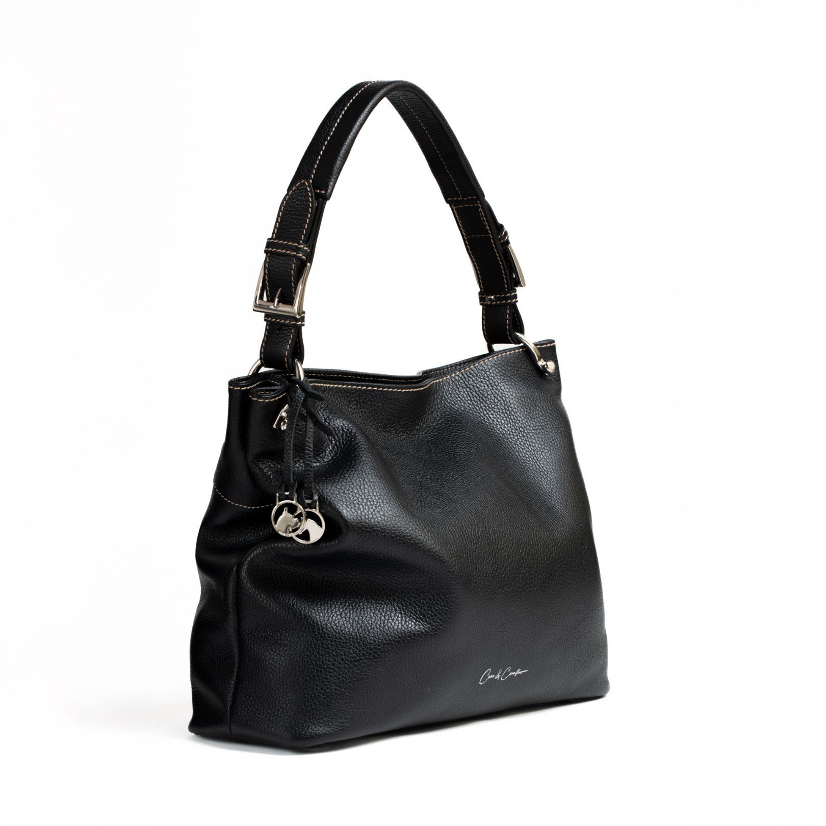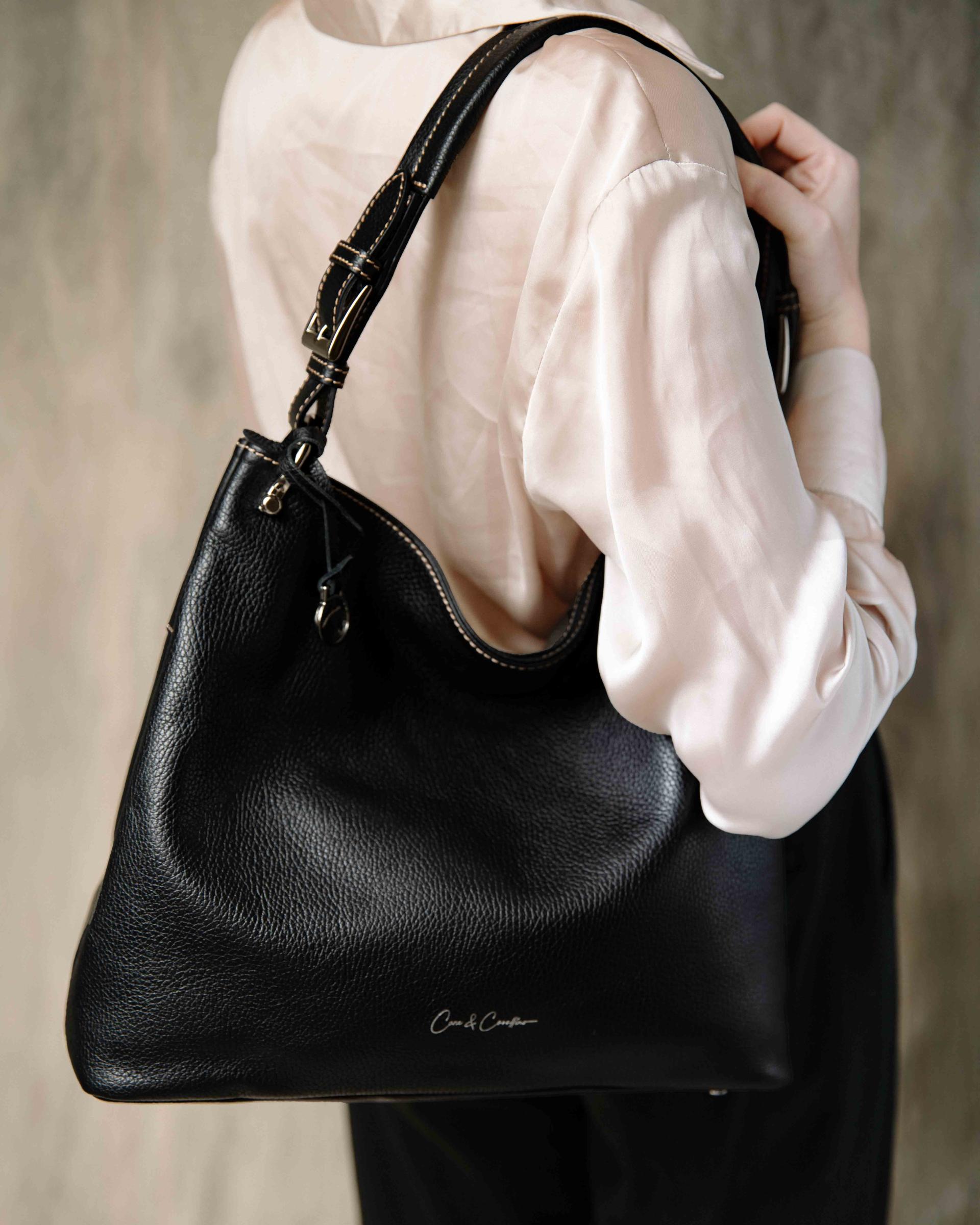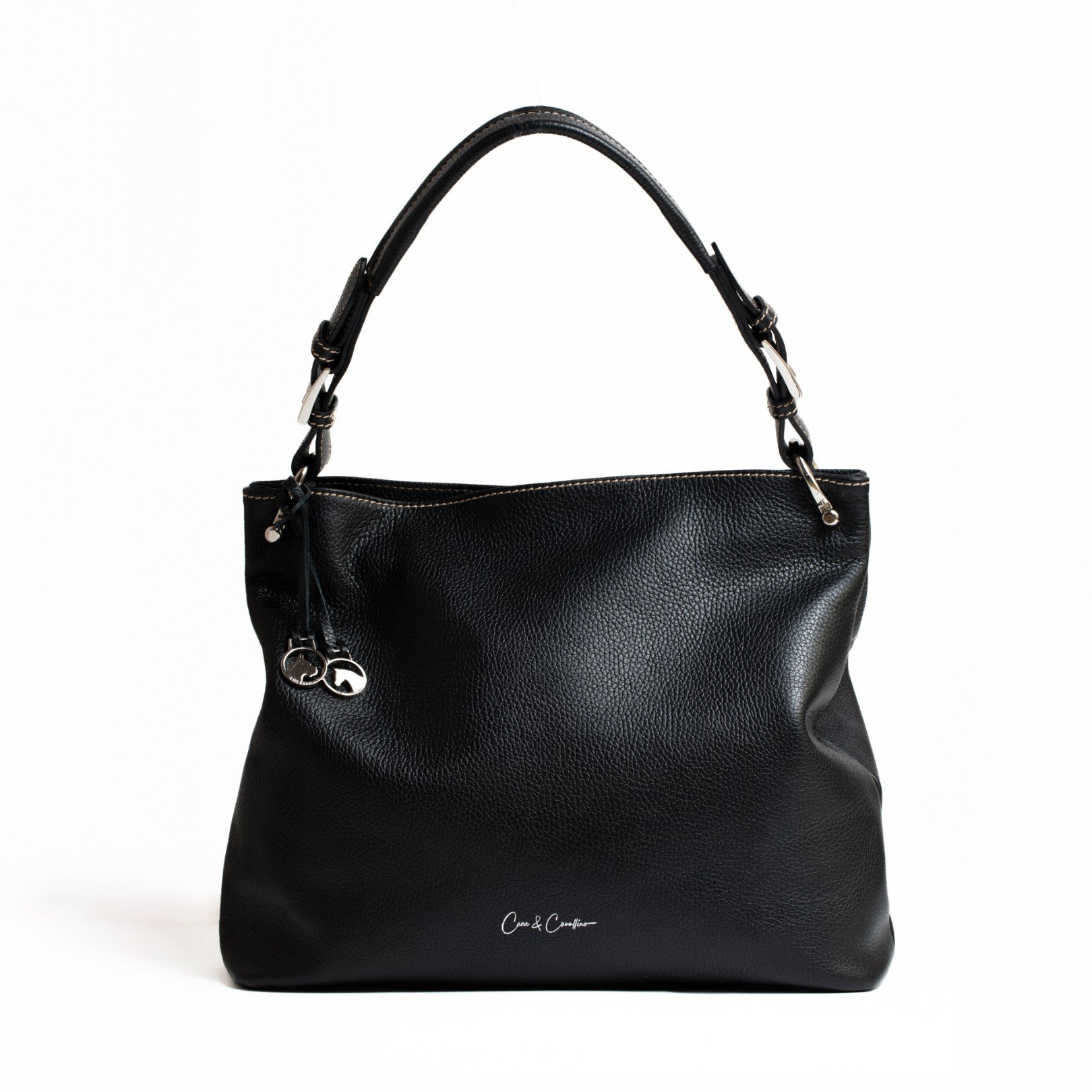 De Breton Schoudertas Zwart van Cane & Cavallino is een ruime, elegante hobo schoudertas, gemaakt van soepel Italiaans kalfsleer. Met haar nonchalante en tijdloze design is deze tas perfect voor dagelijks gebruik, of het nu gaat om een dagje shoppen, een avondje uit of een snelle boodschap.