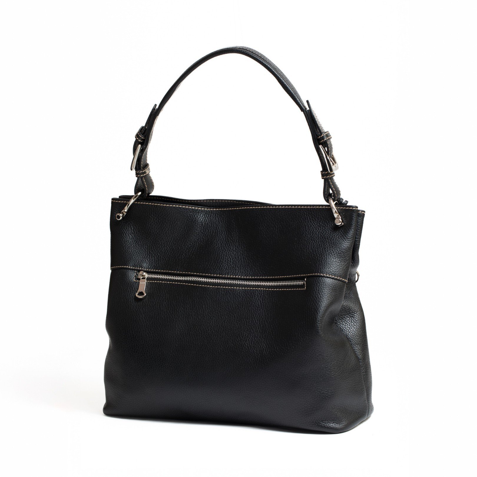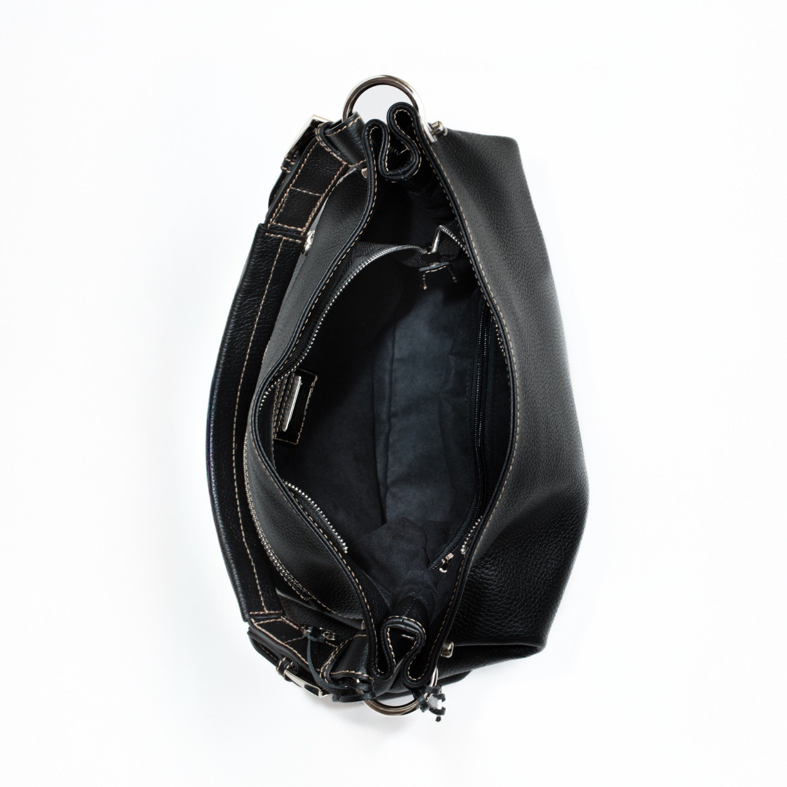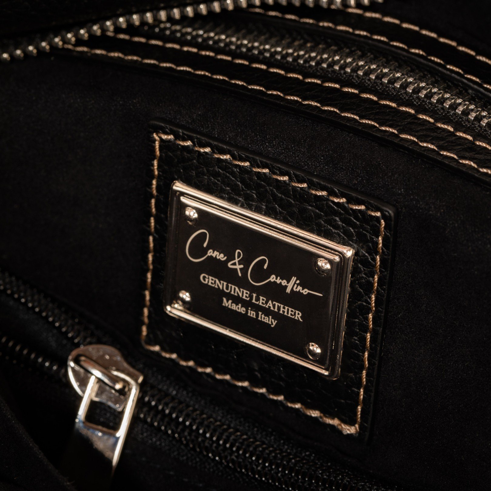 Het zwarte leer is afgewerkt met een lichte beige stiknaad, zilveren ritsen en het zilveren Cane & Cavallino-logo op de voorzijde. De achterzijde van de tas bevat een handig vak met een ritssluiting. Het interieur is ruim en voorzien van een zachte, zwarte suède voering, verdeeld in twee grote open vakken met een centraal vak met ritssluiting.