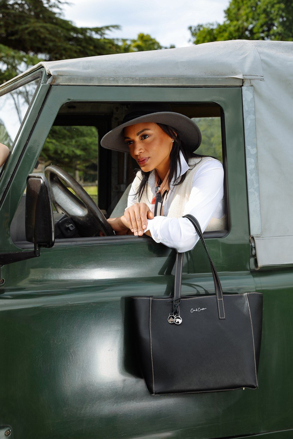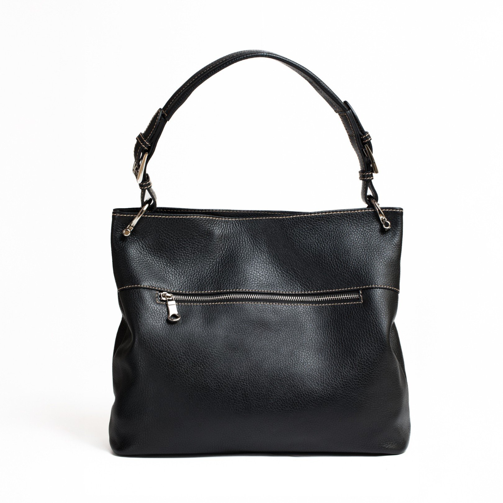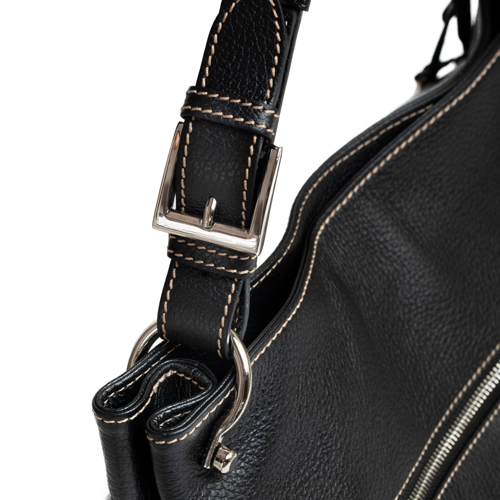 Het zwarte leer is afgewerkt met een lichte beige stiknaad, zilveren ritsen en het zilveren Cane & Cavallino-logo op de voorzijde. De achterzijde van de tas bevat een handig vak met een ritssluiting. Het interieur is ruim en voorzien van een zachte, zwarte suède voering, verdeeld in twee grote open vakken met een centraal vak met ritssluiting.