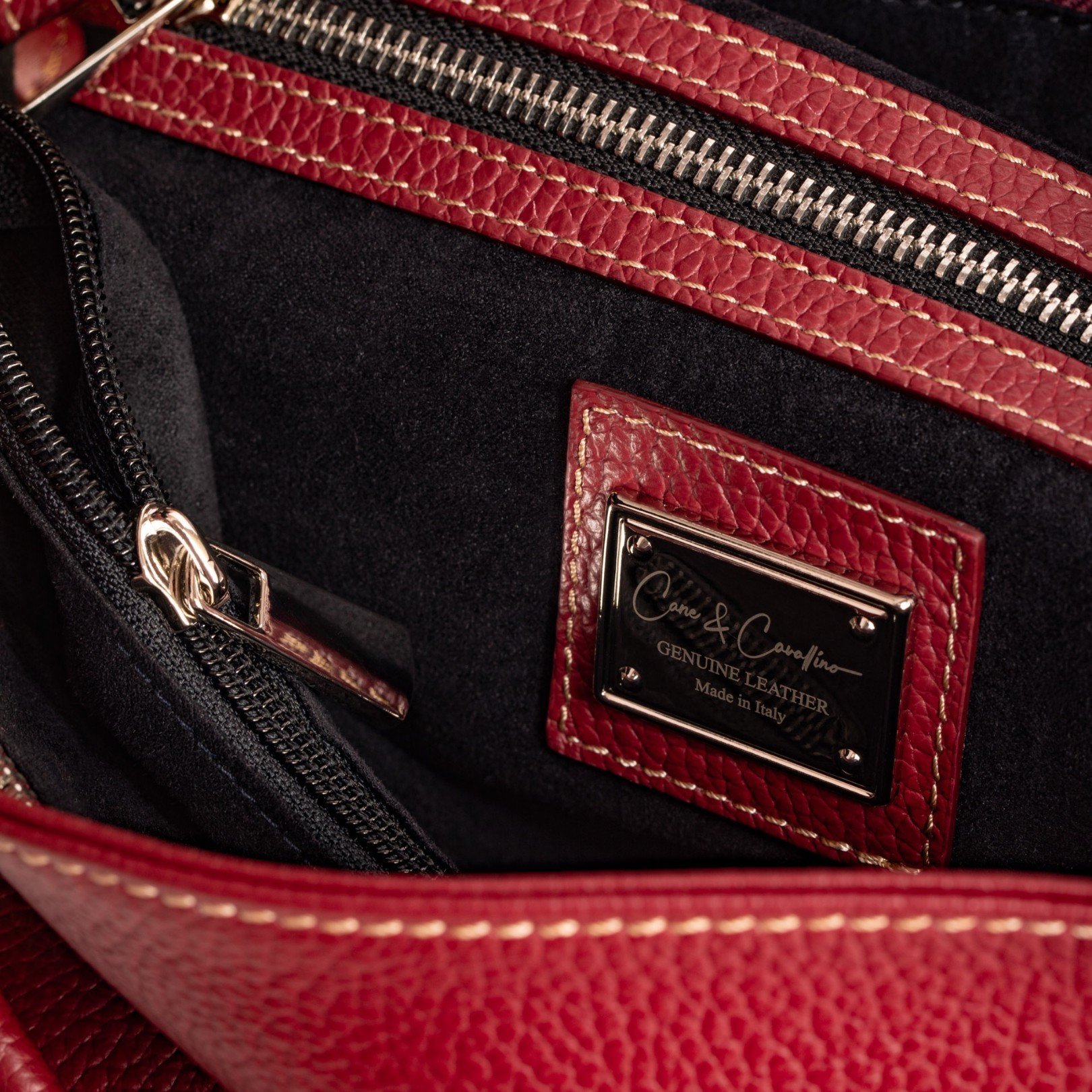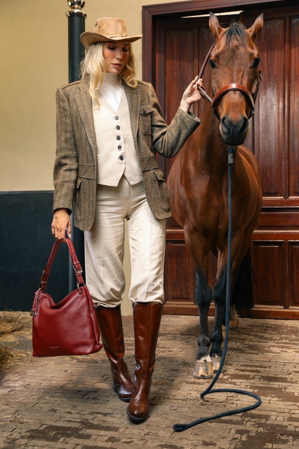 Het bordeauxrode leer is afgewerkt met een licht beige stiknaad, zilveren ritsen en het zilveren Cane & Cavallino logo aan de voorzijde. De brede schouderband is voorzien van zilveren, afneembare hangers in de vorm van een paard en hond silhouet, een subtiele knipoog naar onze roots. Het ruime suède interieur heeft meerdere vakken met ritsen en een stevige indeling voor optimale organisatie. De tas wordt geleverd met een luxe satijnen stofzak en heeft bodemnagels ter bescherming.