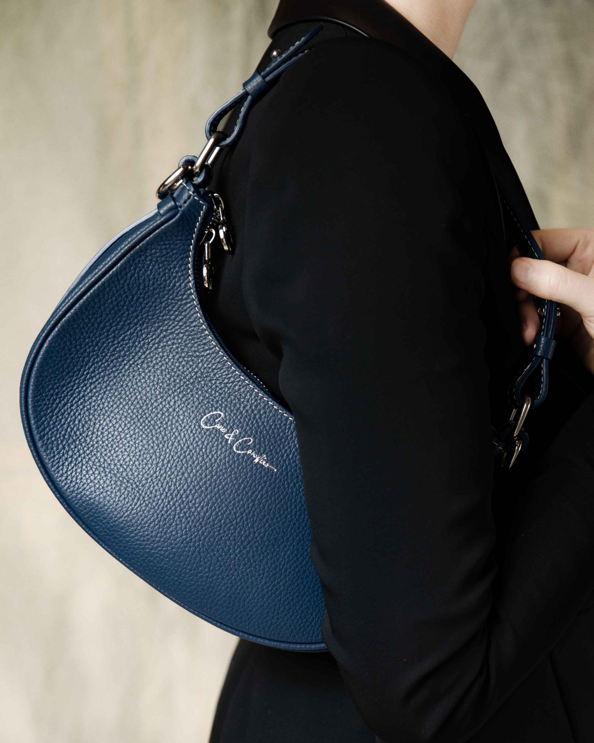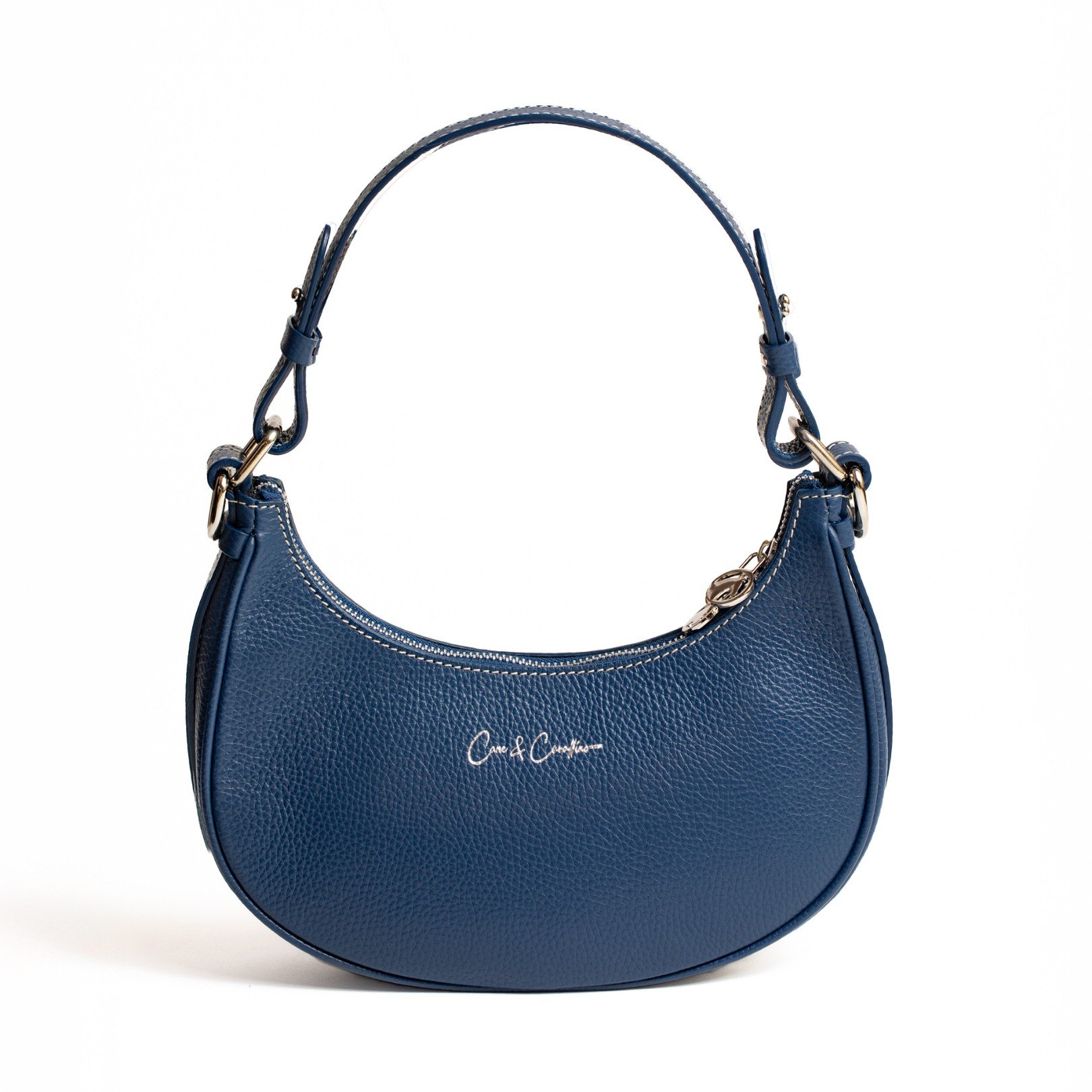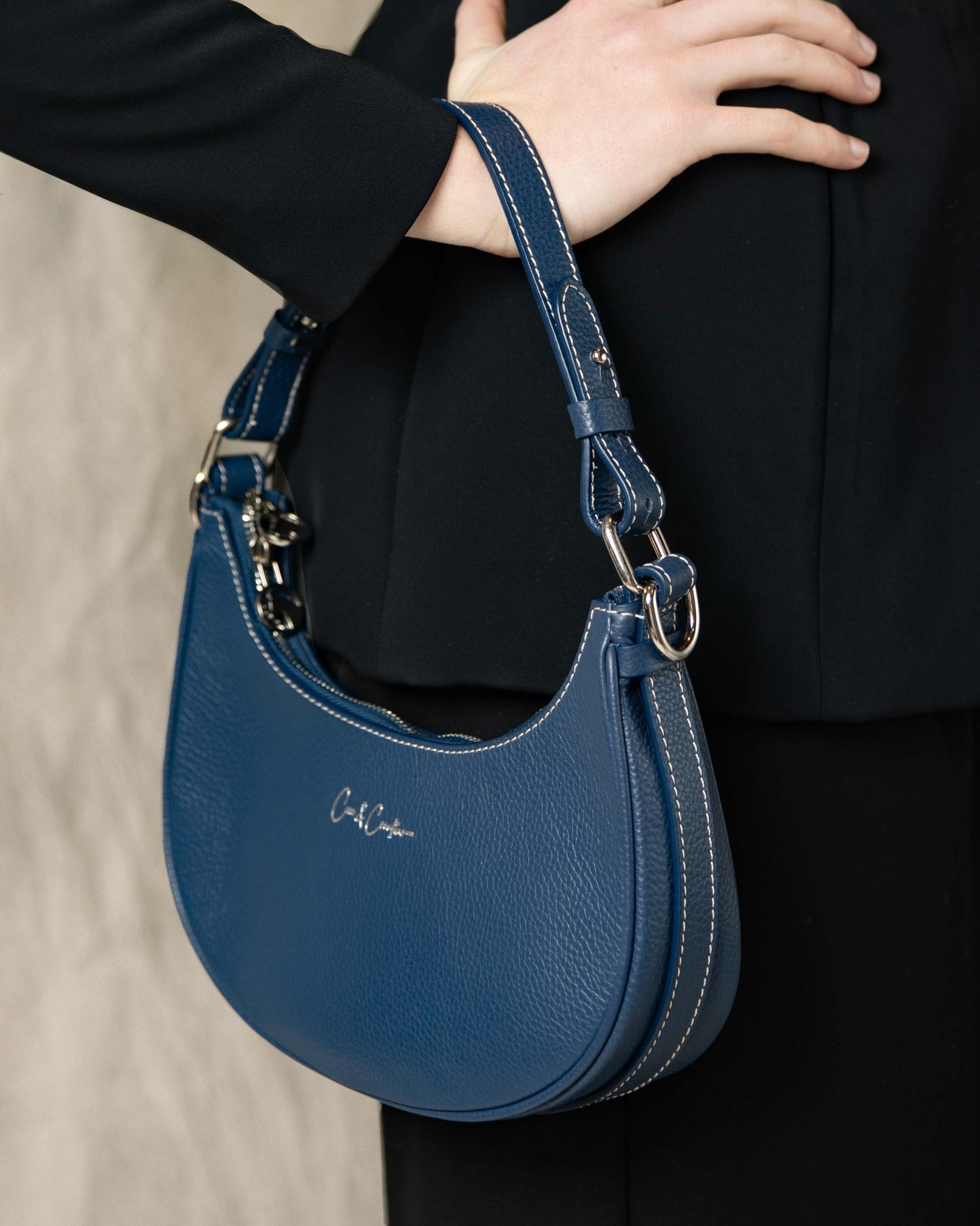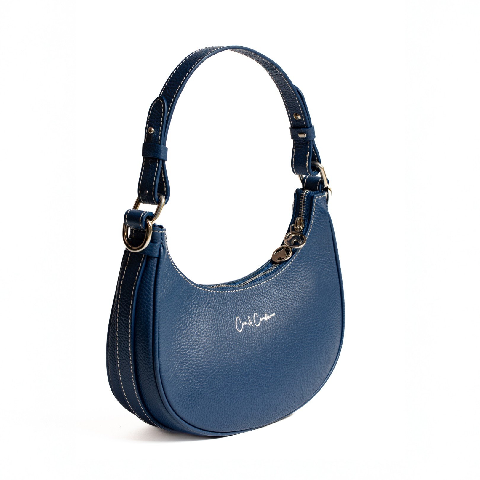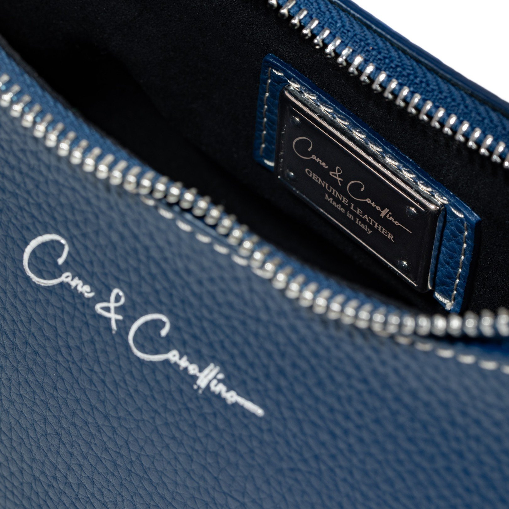 De mindernachtblauwe mini schoudertas heeft een halvemaan design, wat zorgt voor een speelse uitstraling. De Falabella is je partner in crime tijdens brunch of dinner, je dagje shoppen of avond in de club. Het blauwe, soepele, Italiaanse leer heeft een witte stiknaad en is voorzien van het logo van Cane&Cavallino in het zilver. De tas kan over de schouder of crossbody gedragen worden, door middel van de meegeleverde afneembare en verstelbare crossbodyriem. De zilveren rits is voorzien van zilveren Cane & Cavallino hangers, waarmee je de tas opent en sluit. De binnenkant van deze bag is afgewerkt met zwart suède en je vindt er een klein zijvakje. Ook is de binnenzijde afgewerkt met het zilveren embleem van Cane&Cavallino. Al onze tassen worden geleverd met een satijnen Cane&Cavallino stofzak.