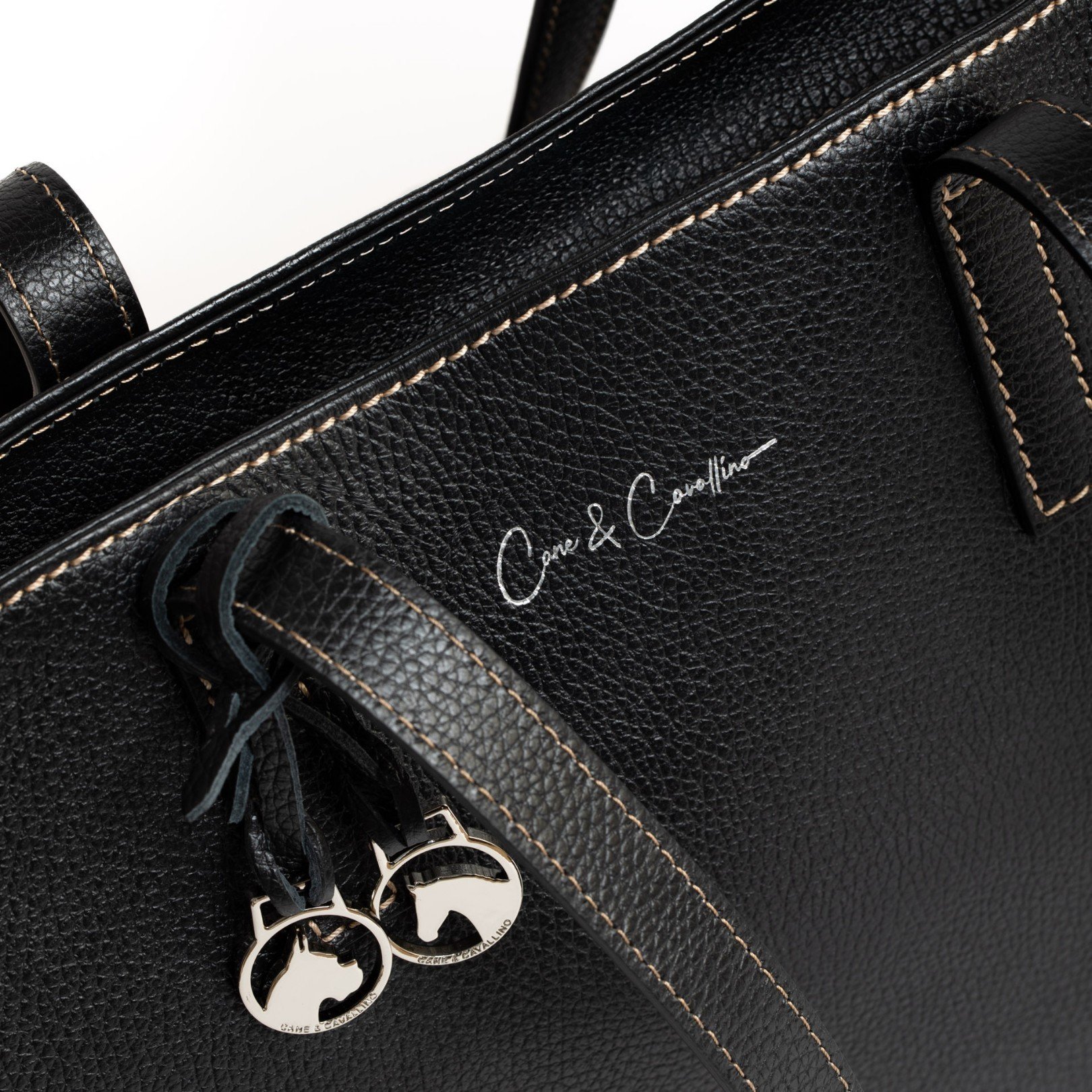 De Salernitano Draagtas is een ruime, staande tas gemaakt van Italiaans leer. Met haar strakke, tijdloze, maar praktische vormgeving is de Salernitano zeer geschikt voor kantoordagen, maar kan net zo goed mee naar je avond dineren met vriendinnen. Deze grote tas is voorzien van lange hengsels, waardoor hij comfortabel draagt. Het zwarte leer heeft een licht beige stiknaad, zilveren rits en ritssluiting en zilveren afneembare Cane & Cavallino hangers. De voorkant van de Tote bag is voorzien van het logo van Cane & Cavallino in het zilver. De zwarte, suède binnenkant is voorzien van een binnenvakje wat kan worden afgesloten door middel van een zwarte rits met zilveren ritssluiting. Daarlangs zitten er nog twee open binnenvakjes in en een zwarte, leren portmonnee welke bevestigd is aan de tas. De portomonnee is voorzien van een zilveren rits en ritsslutiing. Ook is de binnenzijde afgewerkt met het zilvere embleem van Cane & Cavallino. De tas heeft bodemnagels om beschadigingen te voorkomen. Al onze tassen worden geleverd met een satijnen Cane & Cavallino stofzak.